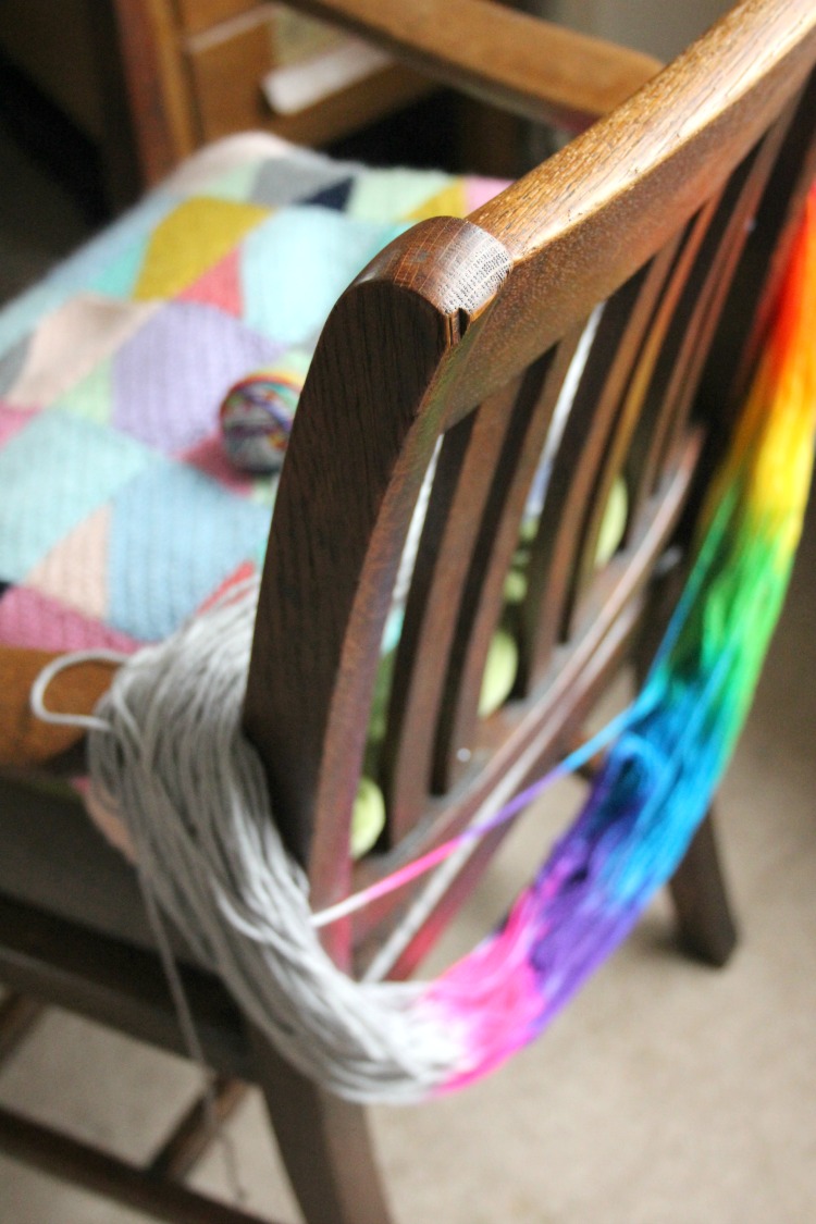 I bought the rainbow dyed yarn from a UK dyer, Rhapsodye Yarns. It’s a superwash merino, and it’s just lovely! See the running rainbow? I’d like only two, maybe three colours, each long enough to make a triangle, with grey in between each shade. Do you think I need to take up yarn dying as a hobby next?! I’m tempted to contact the dyer and make a special request instead. Seriously, I do not need any more hobbies right now.